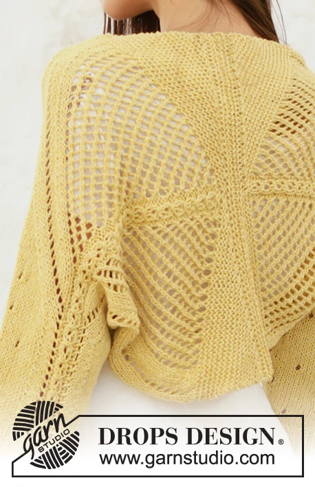 Strikket bolero i DROPS Belle. Arbejdet strikkes fra ærmet til midt bagpå i hulmønster. Størrelse S - XXXL.