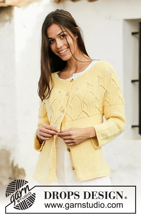 Strikket jakke med rundt bærestykke i DROPS Merino Extra Fine. Arbejdet strikkes ovenfra og ned med struktur, hulmønster og A-facon. Størrelse S - XXXL.