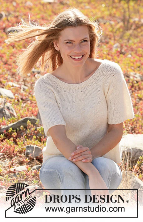 Strikket bluse med korte ærmer og rundt bærestykke i DROPS Sky. Arbejdet strikkes ovenfra og ned. Størrelse S - XXXL.