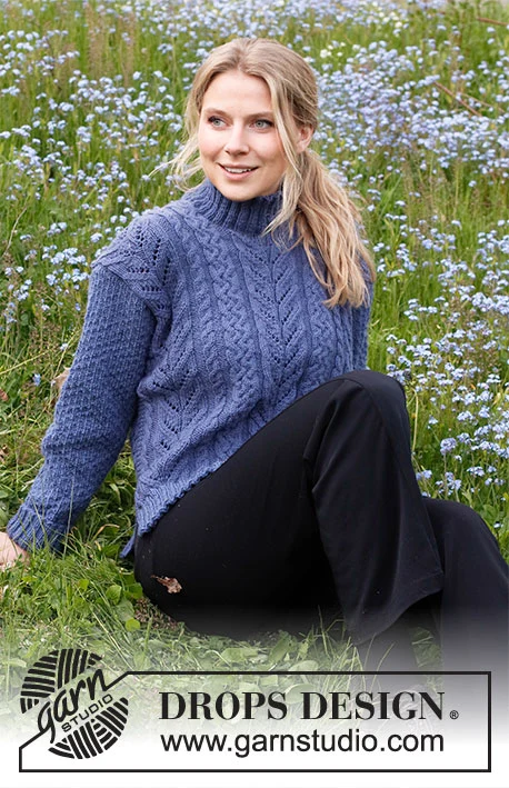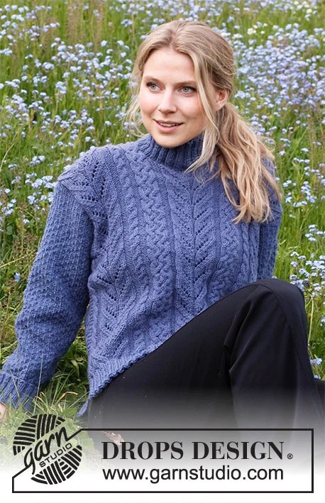 Strikket bluse i DROPS Merino Extra Fine. Arbejdet strikkes med snoninger, hulmønster, strukturmønster og høj hals. Størrelse S - XXXL.