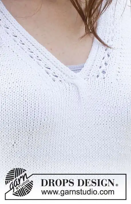 Strikket bluse i DROPS Belle. Arbejdet strikkes nedenfra og op med v-hals og hulmønster. Størrelse S - XXXL.