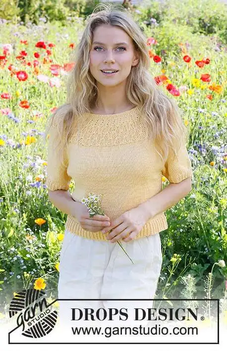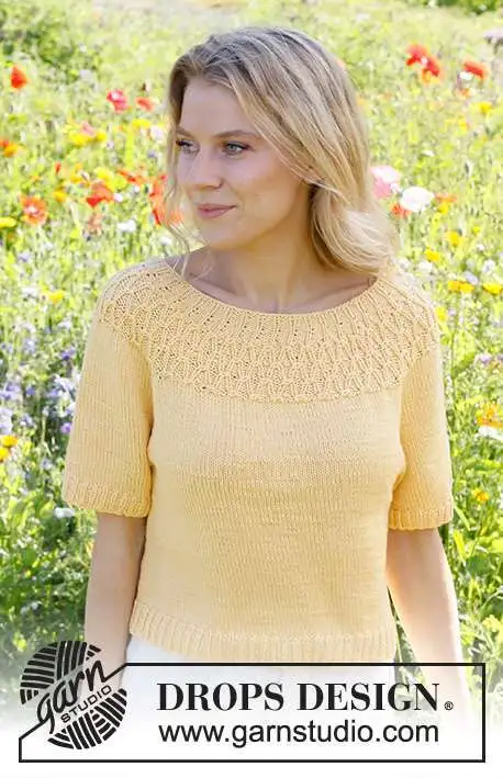Strikket bluse med korte ærmer / t-shirt i DROPS Muskat. Arbejdet strikkes oppefra og ned med rundt bærestykke og snoninger. Størrelse S-XXXL.