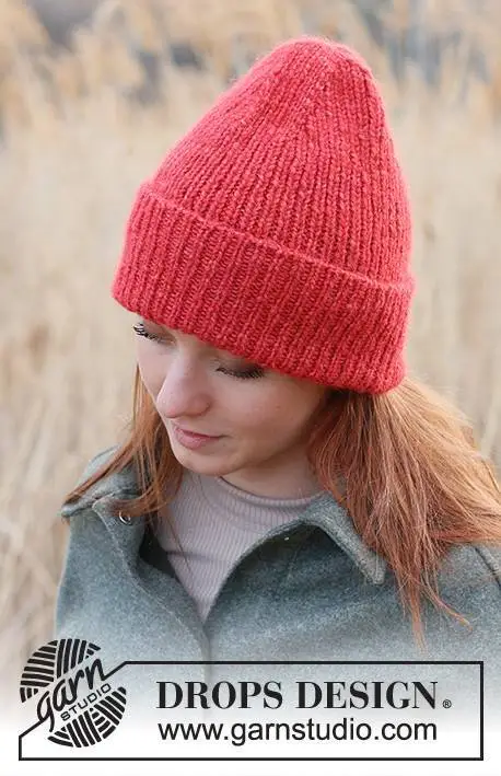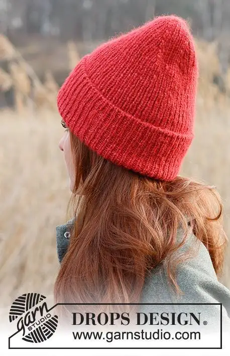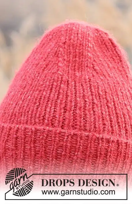 Strikket hue / hipsterhue i DROPS Air. Arbejdet strikkes nedefra og op i rib med opsmøg.