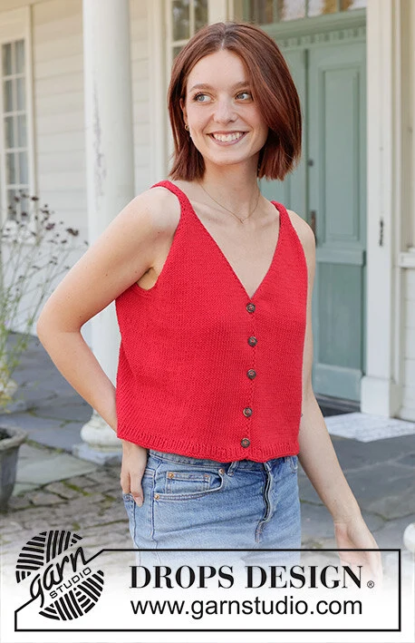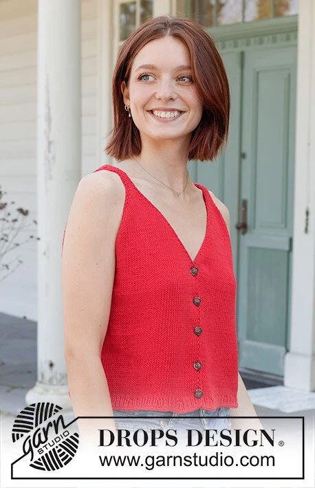 Strikket top / vest i DROPS Cotton Light. Arbejdet strikkes oppefra og ned med glatstrik, i-cord og v-hals. Størrelse S - XXXL.