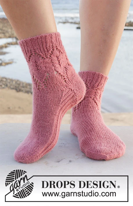 Strikkede sokker i DROPS Nord. Arbejdet strikkes ovenfra og ned med snoninger og hulmønster. Størrelse 35 - 43.