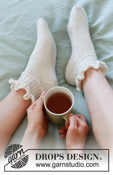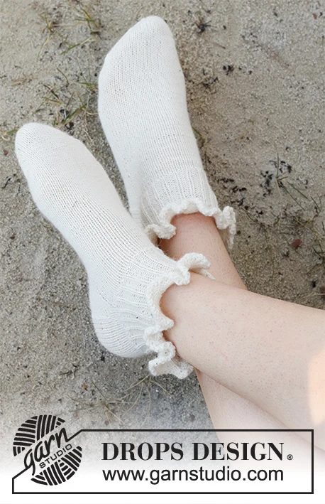 Strikkede sokker med flæsekant i DROPS Fabel. Arbejdet strikkes ovenfra og ned. Størrelse 35-42.