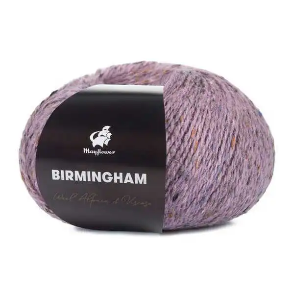 Mayflower Birmingham er et blødt garn spundet på sydamerikansk uld tilsat alpaka og viskose. Viskosen er med til at skabe de flotte tweednister der kendetegner garnet, og giver garnet et flot farvespil. Alpakafibrene er med til at give garnet en flot glans. Birmingham er et fint garn hvor den anbefalet pind er 3,00-3,50 mm. Dog kan det strikkes dobbelt på pind 4-5mm som giver det færdige projekt mere volumen.
