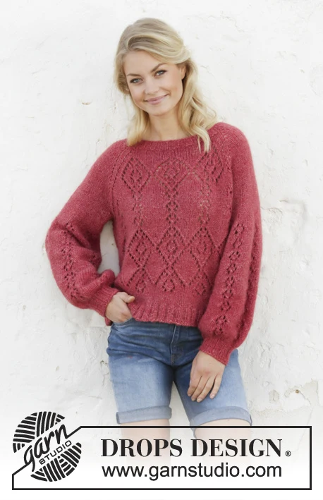 Strikket bluse med raglan og ballonærmer i DROPS Air. Arbejdet strikkes ovenfra og ned med hulmønster. Størrelse S - XXXL.