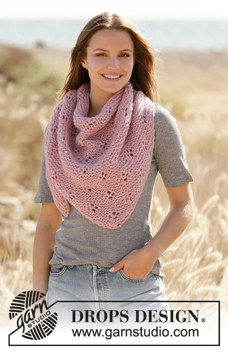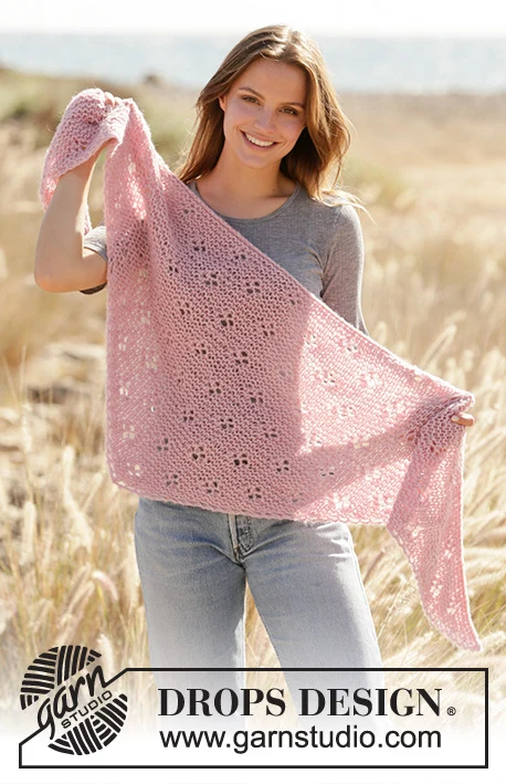 Strikket sjal i DROPS Air. Arbejdet strikkes med retstrik og hulmønster.