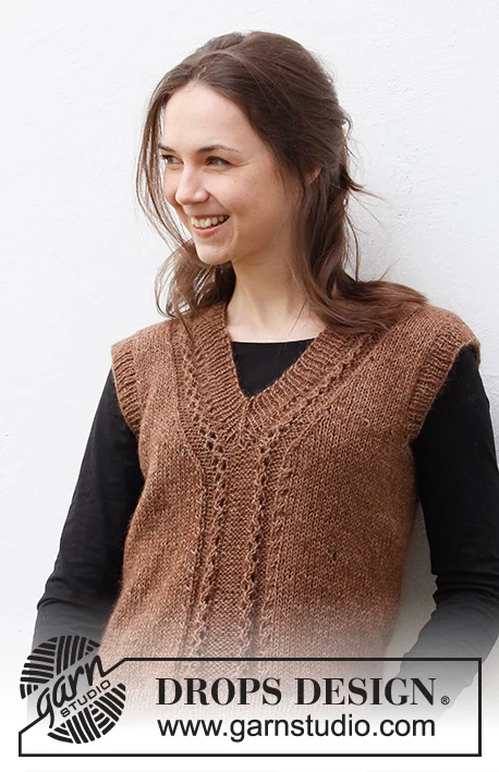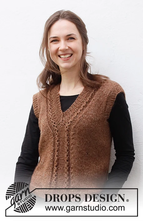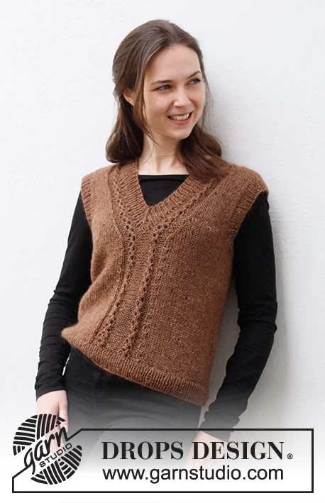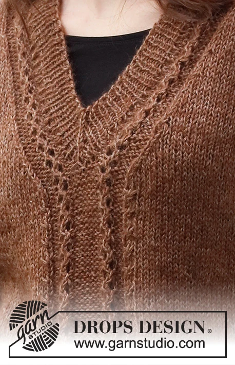 MATERIALER: DROPS FLORA fra Garnstudio (tilhører garngruppe A) 150-150-150-150-200-200 g farve 08, brun Og brug: DROPS KID-SILK fra Garnstudio (tilhører garngruppe A) 75-75-75-100-100-100 g farve 35, chokolade
