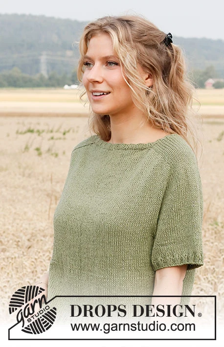 Strikket bluse i DROPS Belle eller DROPS Sky. Arbejdet strikkes ovenfra og ned med sadelskuldre og korte ærmer. Størrelse S - XXXL.
