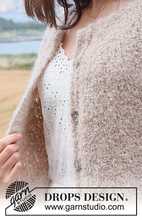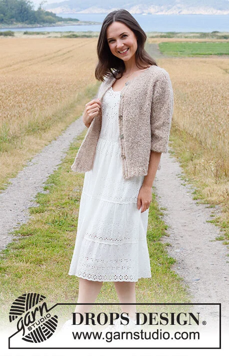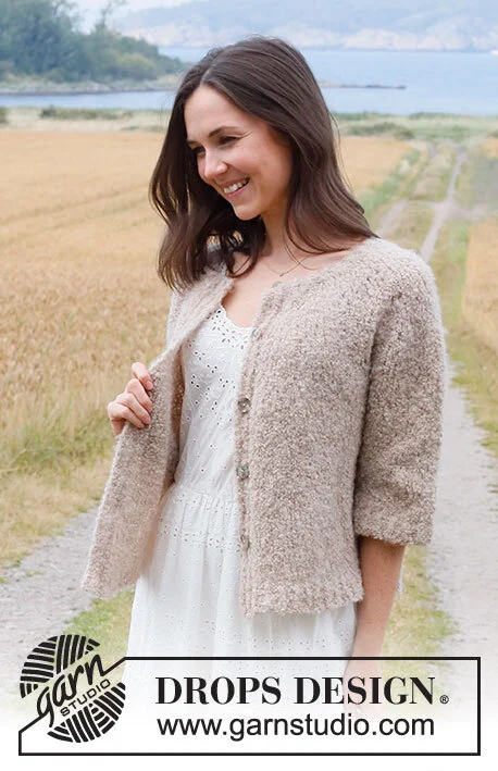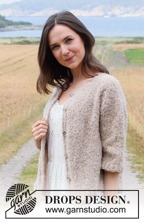 Strikket jakke i DROPS Alpaca Bouclé. Arbejdet strikkes oppefra og ned med rundt bærestykke og ¾ lange ærmer. Størrelse S - XXXL.
