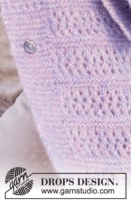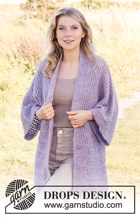 Strikket jakke uden ærmesøm i DROPS Air. Arbejdet strikkes med hulmønster og sjalskrave. Størrelse S - XXXL.