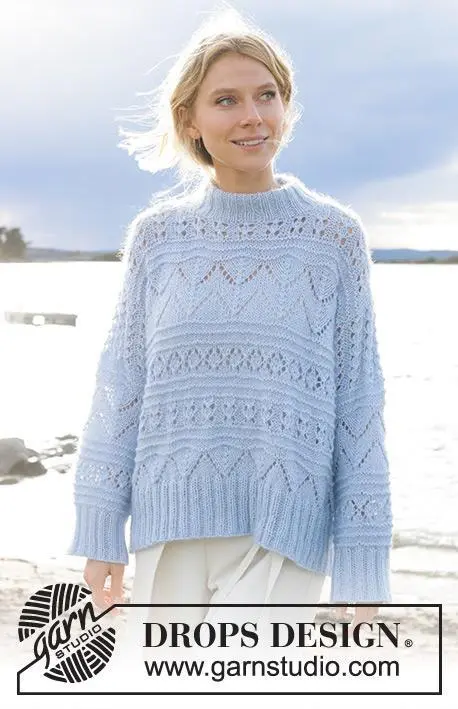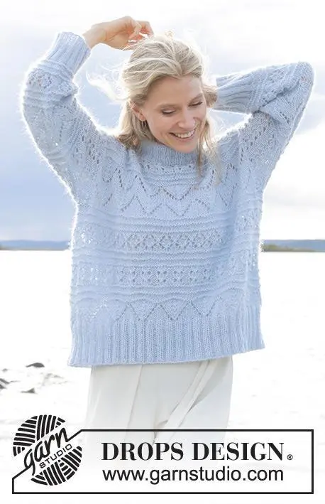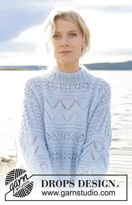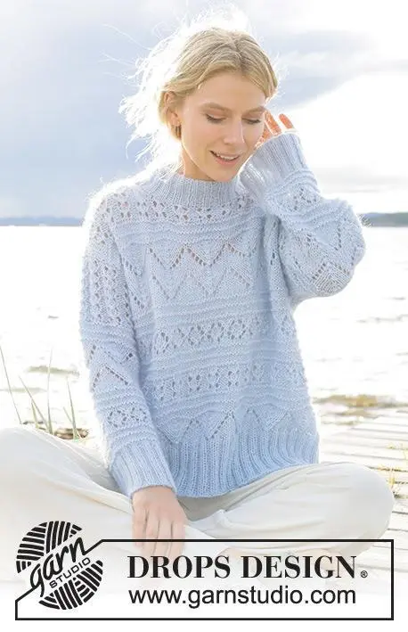 Strikket bluse i DROPS BabyMerino og DROPS Kid-Silk. Arbejdet strikkes oppefra og ned med europæisk skulder / skrå skulder og hulmønster. Størrelse S - XXXL.