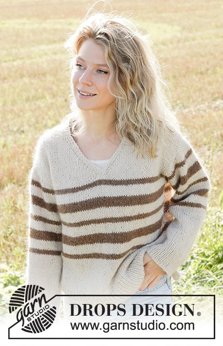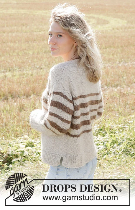 Strikket bluse i DROPS Soft Tweed og DROPS Kid-Silk. Arbejdet strikkes oppefra og ned med skrå skulder / europæisk skulder, V-hals, striber og slids i siderne. Størrelse S - XXXL.