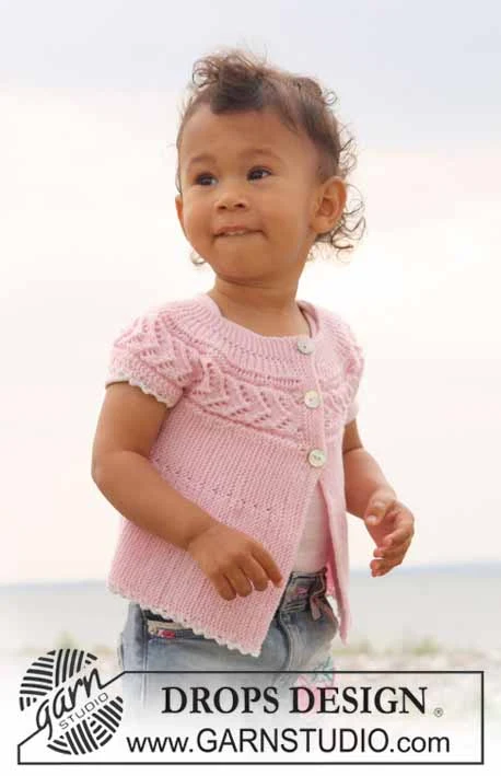 Kortærmet bluse med knapper strikket fra side til side med retstrik, hulmønster og vendepinde til baby og børn i DROPS Baby Merino.