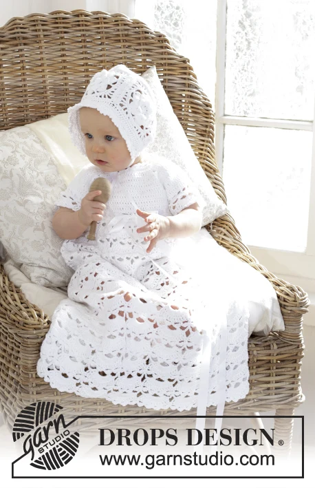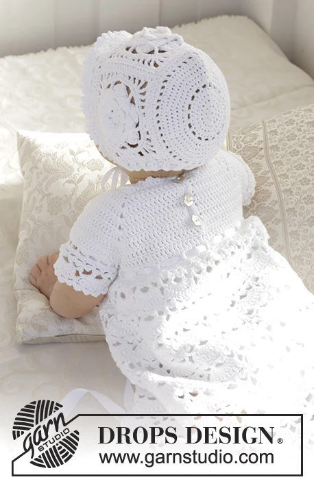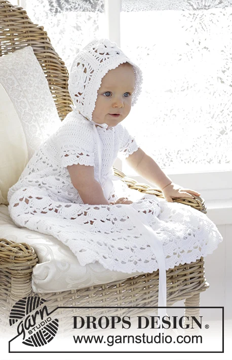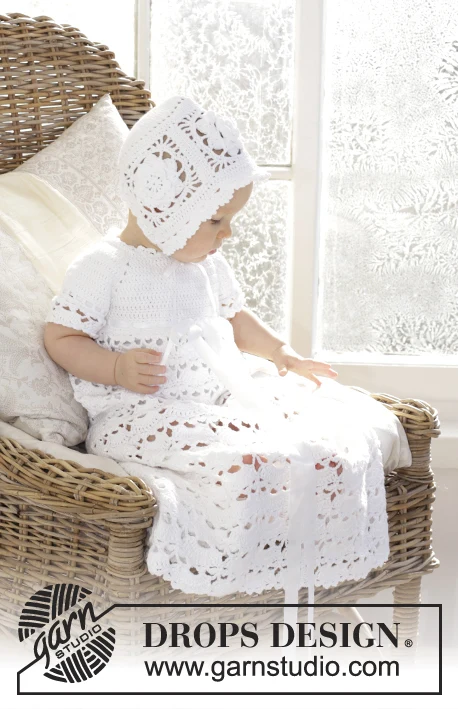 Baby sættet består af: Kjole til dåb eller navnefest hæklet ovenfra med raglan og åbent viftemønster i DROPS Safran. Hæklet hue med blomsterruder og viftekant i DROPS Safran. Størrelse 0 - 2 år