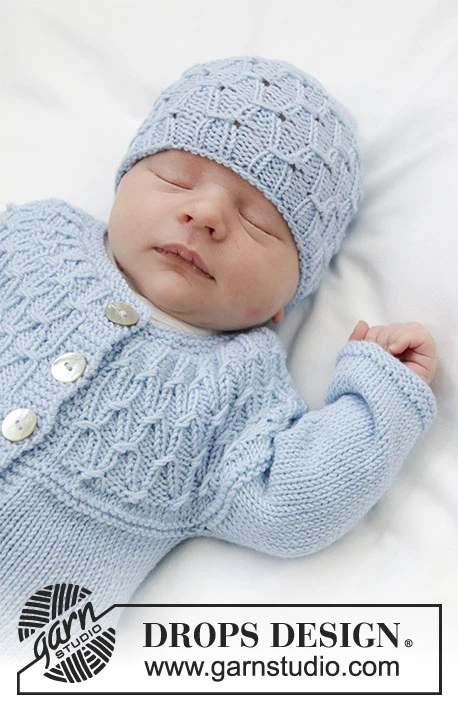 Hue til baby med strukturmønster. Størrelse præmatur – 4 år. Arbejdet er strikket i DROPS Baby Merino eller DROPS Alpaca.