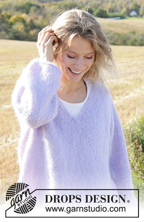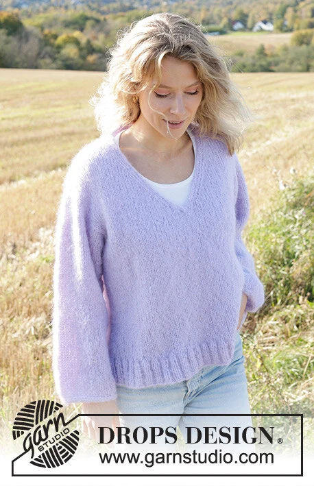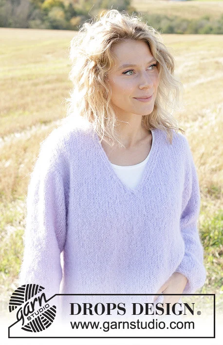 Strikket bluse i DROPS Melody. Arbejdet strikkes oppefra og ned med europæisk skulder / skrå skulder, V-hals og I-cord. Størrelse XS - XXL.