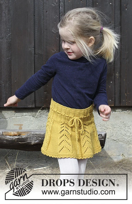 Nederdel med hulmønster og hæklekant til børn, strikket ovenfra og ned. Størrelse 2 - 12 år. Arbejdet er strikket i DROPS Merino Extra Fine.
