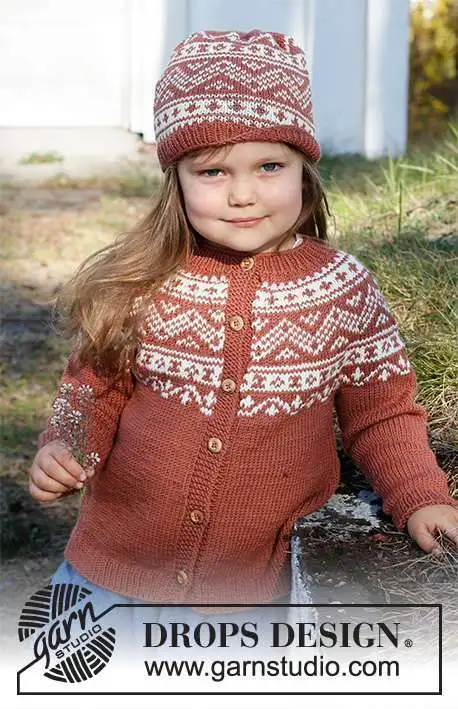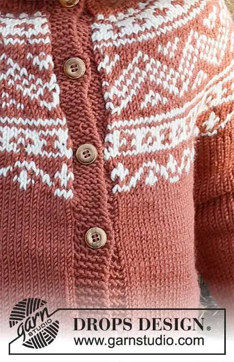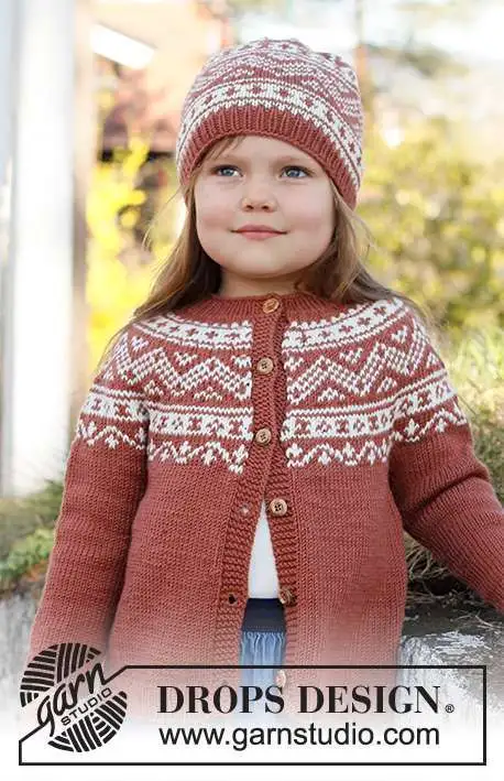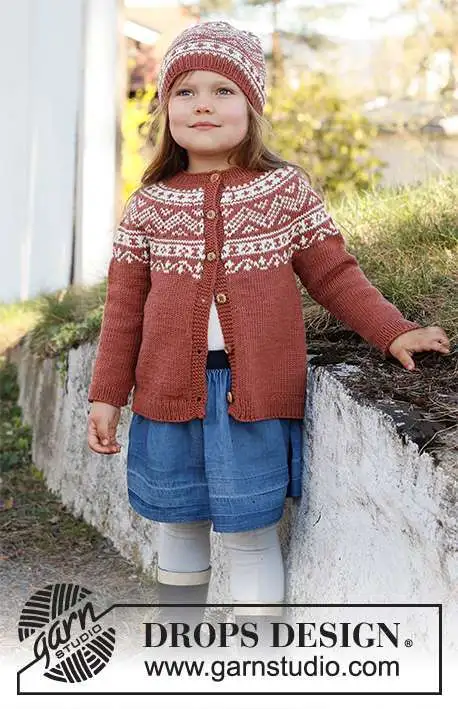 Strikket jakke til børn i DROPS Merino Extra Fine. Arbejdet strikkes oppefra og ned med rundt bærestykke og nordisk mønster på bærestykket. Størrelse 2 – 12 år.