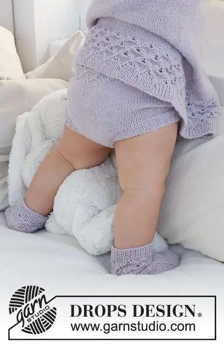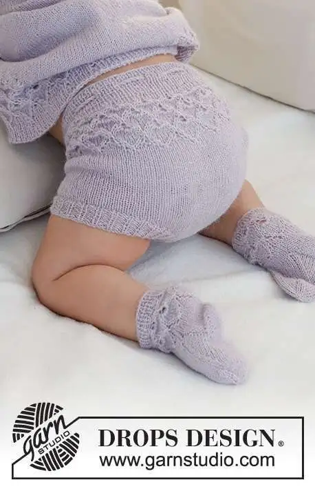 Strikkede shorts til baby i DROPS Alpaca. Arbejdet strikkes oppefra og ned med hulmønster og rib. Størrelse 1 mdr – 2 år.