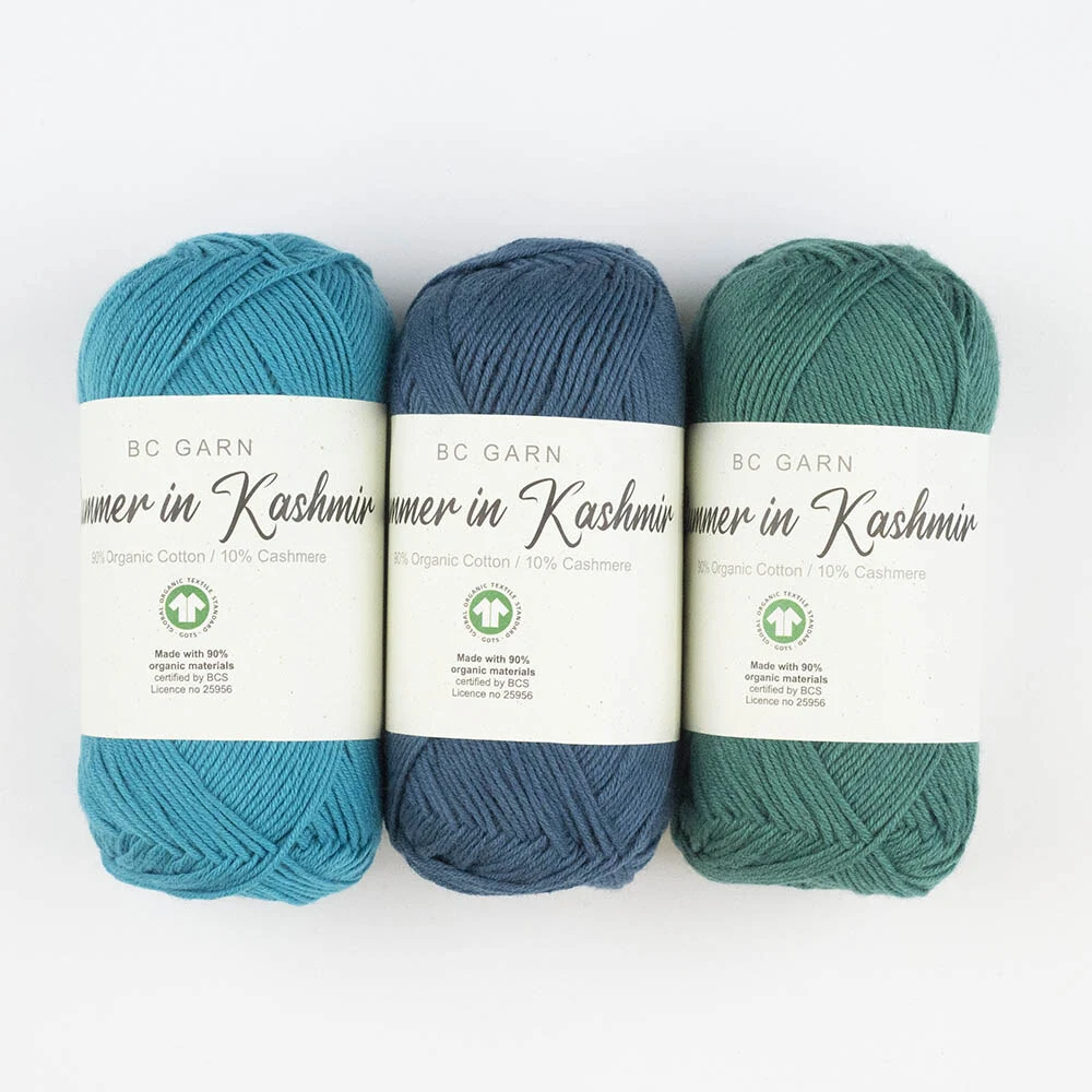 Summer in Kashmir tilbyder den perfekte blanding af vidunderligt blød bomuld og 10% kashmir. Dette GOTS-certificerede øko-garn er velegnet til både indendørs og udendørs brug hele året rundt. Den lille mængde kashmir tilfører garnet et delikat ”fnug”. Farvepaletten er unik og adskiller sig fra standard bomuldsfarver.