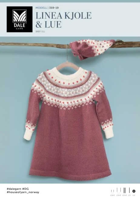 Kjole og Hue strikket/hæklet i Dale Baby Ull.