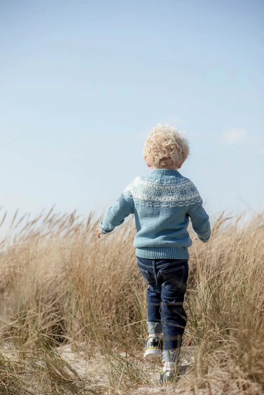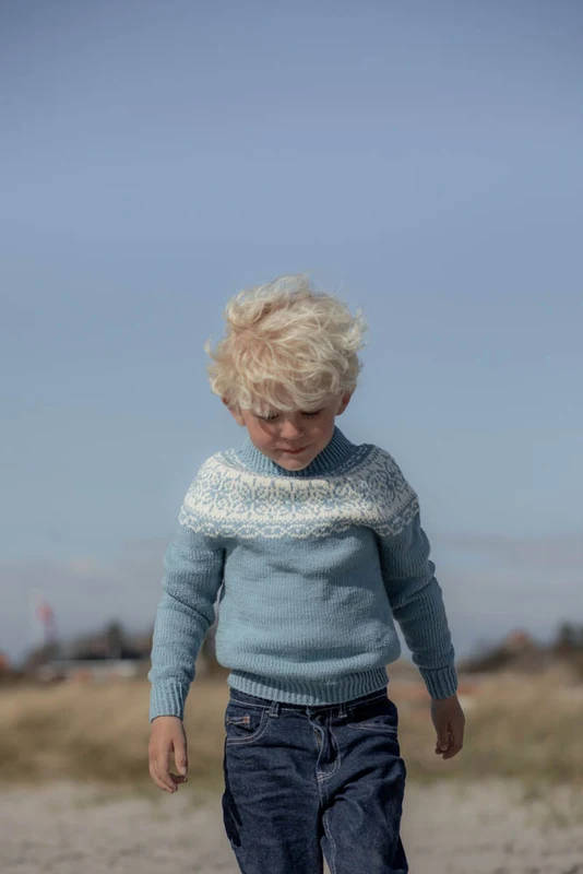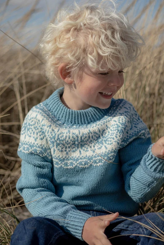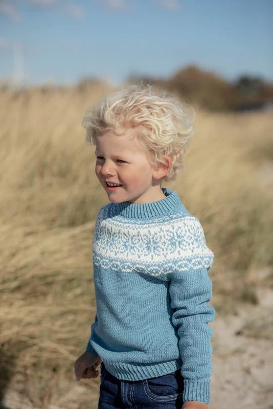Strikket bluse i nordisk mønster til børn i Dale Lerke. Størrelse 2-12 år.