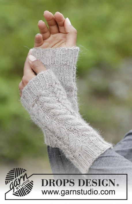 Strikket DROPS hue, hals og pulsvanter i ”DROPS Puna” med snoninger.