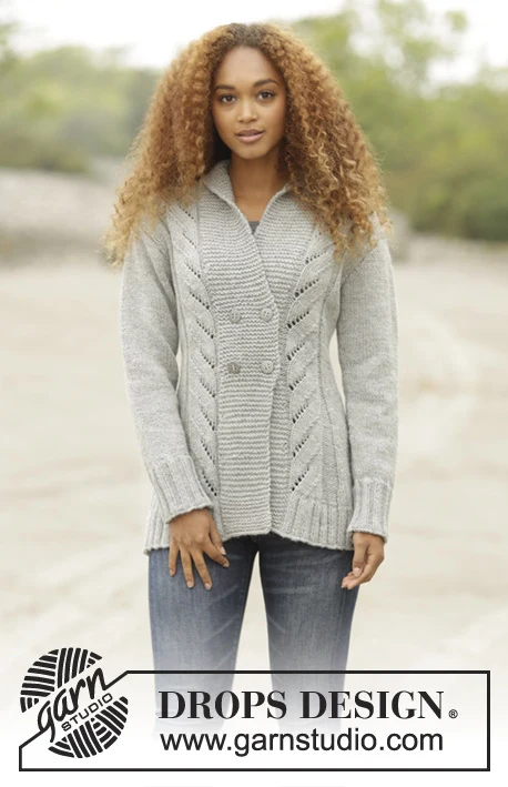 Strikket DROPS jakke i ”DROPS Alaska” med snoninger og sjalskrave. Str S - XXXL.
