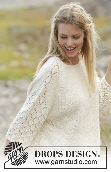 Bluse med hulmønster på skulder og ærme, strikket ovenfra og ned i DROPS Puna. Størrelse S - XXXL