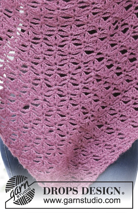 Sjal med viftemønster, hæklet fra spidsen og op. Arbejdet er hæklet i DROPS Air