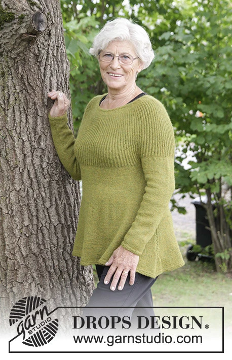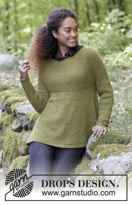 Bluse med rundt bærestykke, patent og A-facon, strikket ovenfra og ned. Størrelse S - XXXL. Arbejdet er strikket i DROPS Alpaca