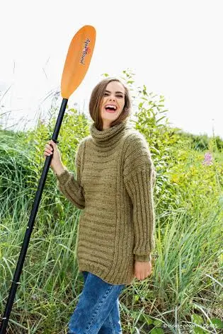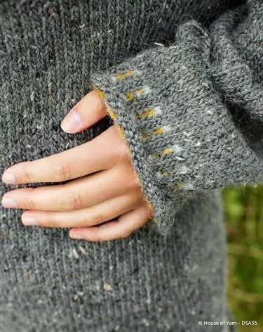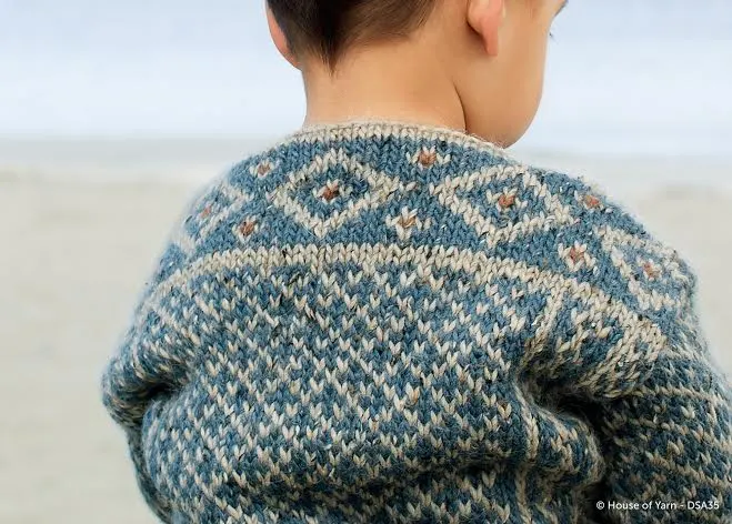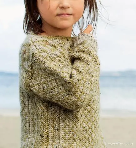Pind: Rundpinde str. 4 og 5, Lille rundpind str. 5 til halsen og Strømpepinde nr. 4 til ærmekanterne