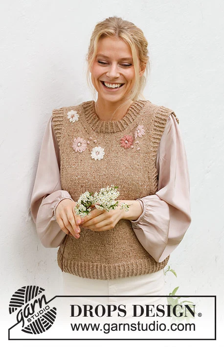 Strikket vest i DROPS Soft Tweed. Arbejdet strikkes med kanter i rib og med broderede blomster og franske knuder. Størrelse S - XXXL.