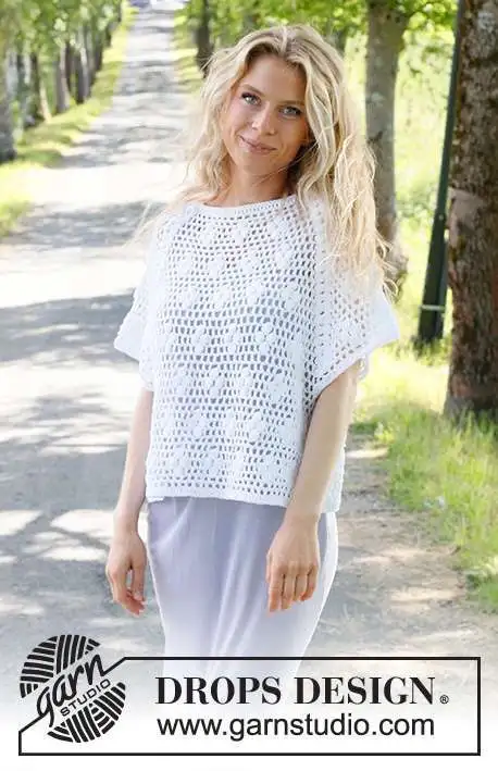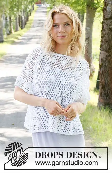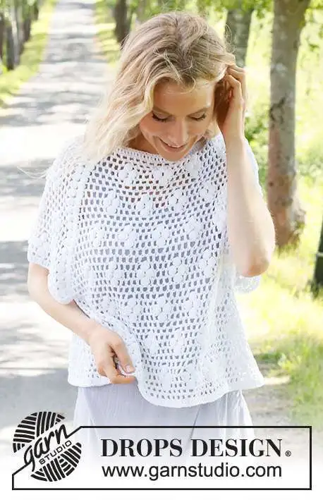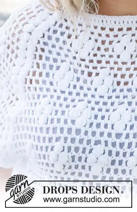 Hæklet top / t-shirt i DROPS Belle. Arbejdet hækles oppefra og ned med raglan, hulmønster og bobler. Størrelse S - XXXL.
