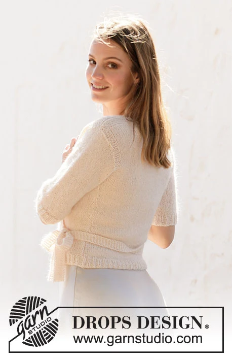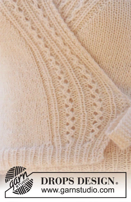 MATERIALER: DROPS BABYALPACA SILK fra Garnstudio (tilhører garngruppe A)* 200-250-250-250-300-300 g farve 1306, pudder* Og brug: DROPS KID-SILK fra Garnstudio (tilhører garngruppe A) 75-75-100-100-100-125 g farve 01, natur
