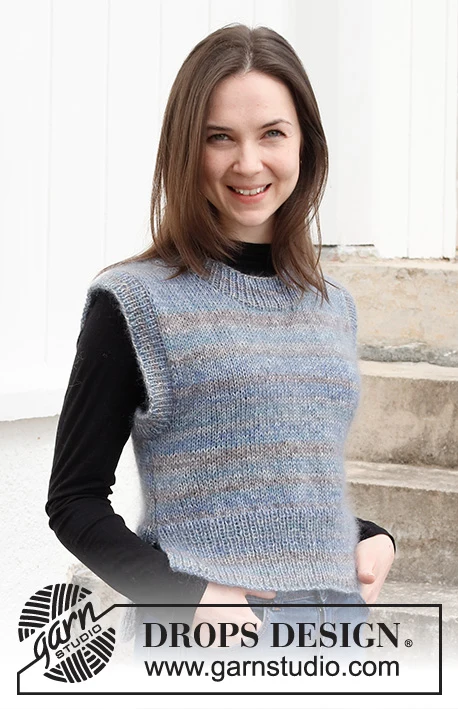 MATERIALER: DROPS Fabel fra Garnstudio (tilhører garngruppe A) 150-150-150-200-200-200 g farve 604, havudsigt Og brug: DROPS Kid-Silk fra Garnstudio (tilhører garngruppe A) 50-75-75-75-75-100 g farve 10, grå