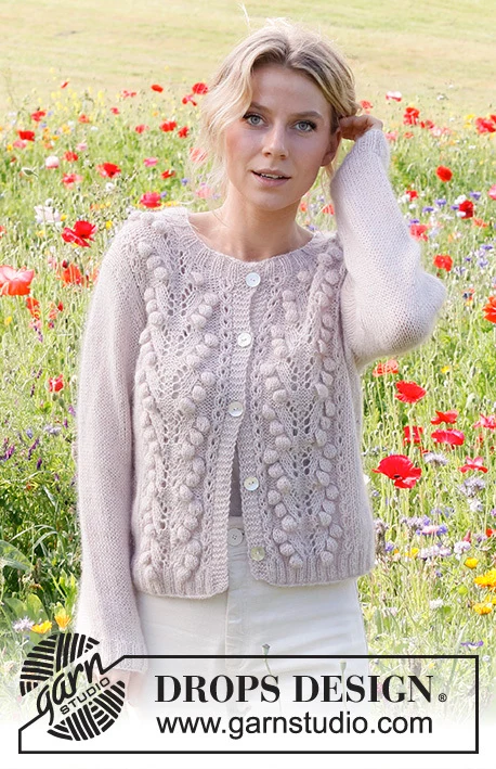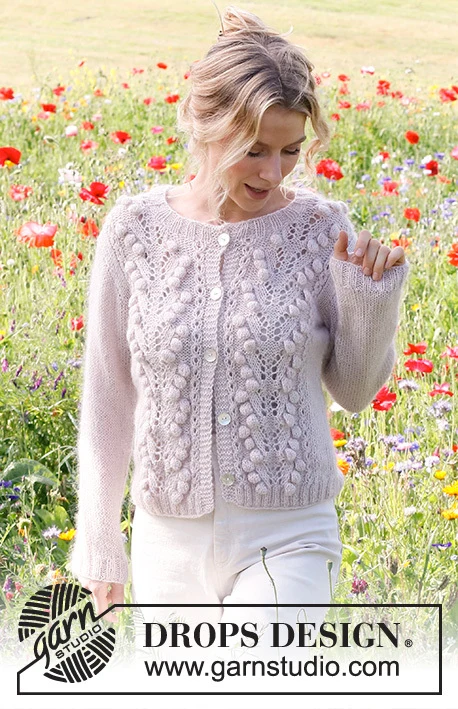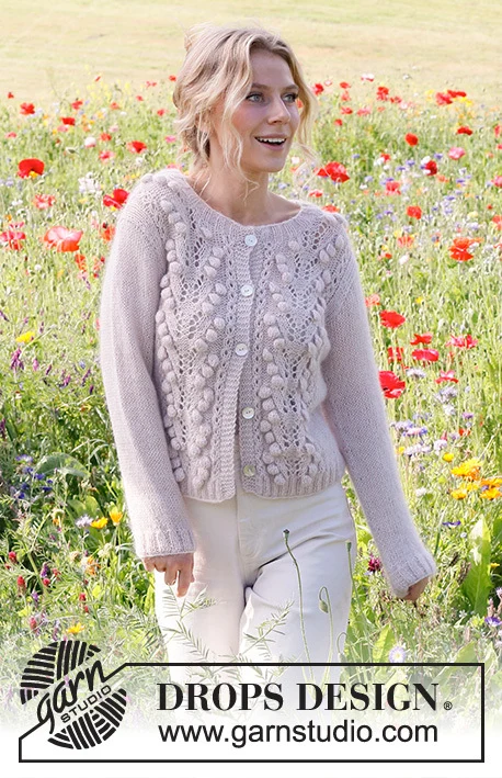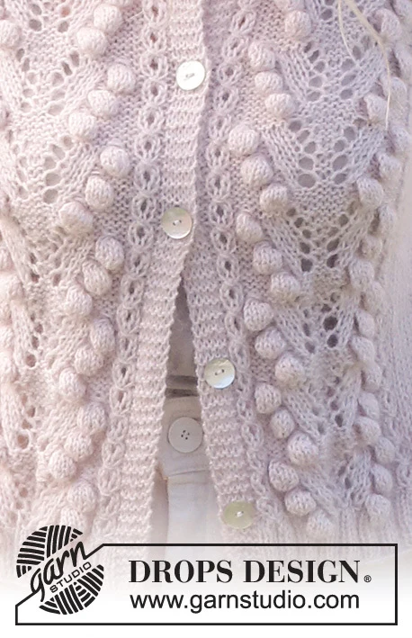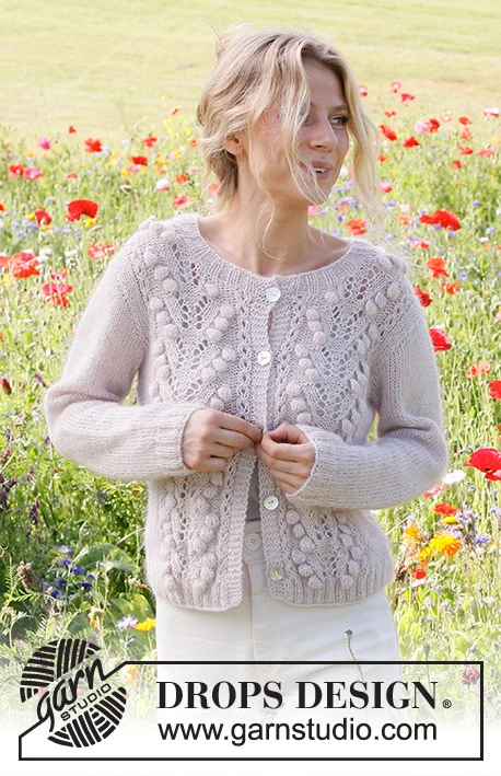 Strikket cardigan i DROPS Flora og DROPS Kid-Silk. Arbejdet strikkes med hulmønster og bobler. Størrelse S - XXXL.