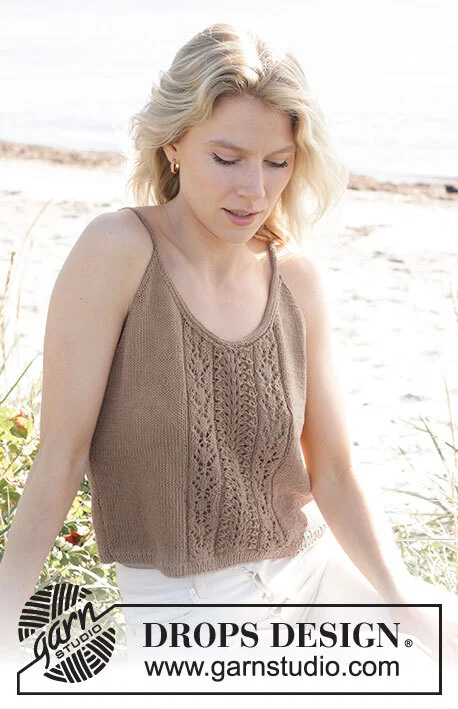 Strikket top / singlet i DROPS Safran. Arbejdet strikkes nedefra og op med hulmønster og I-cord kant. Størrelse S - XXXL.