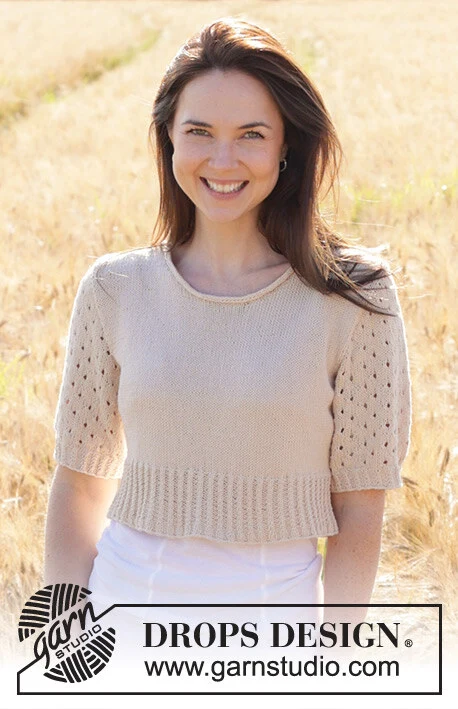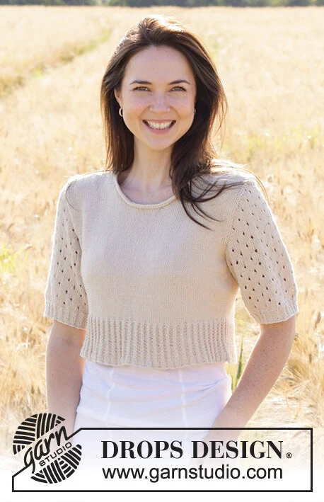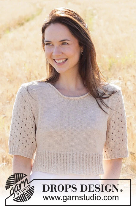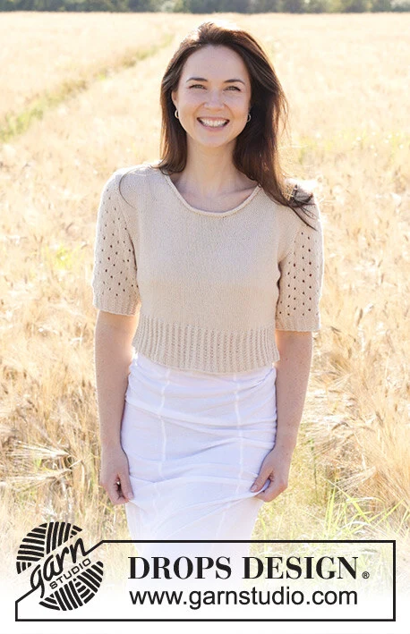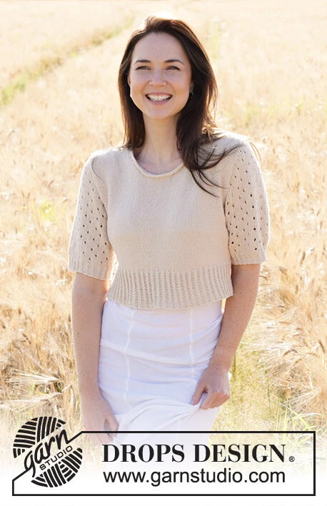 Strikket bluse i DROPS Safran. Arbejdet strikkes nedefra og op med rund hals, isyede korte ærmer, hulmønster, snoninger og I-cord. Størrelse S - XXXL.