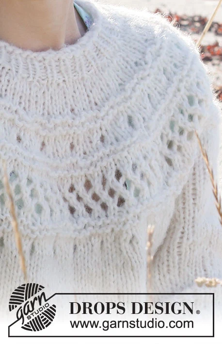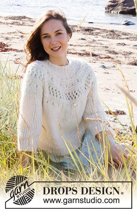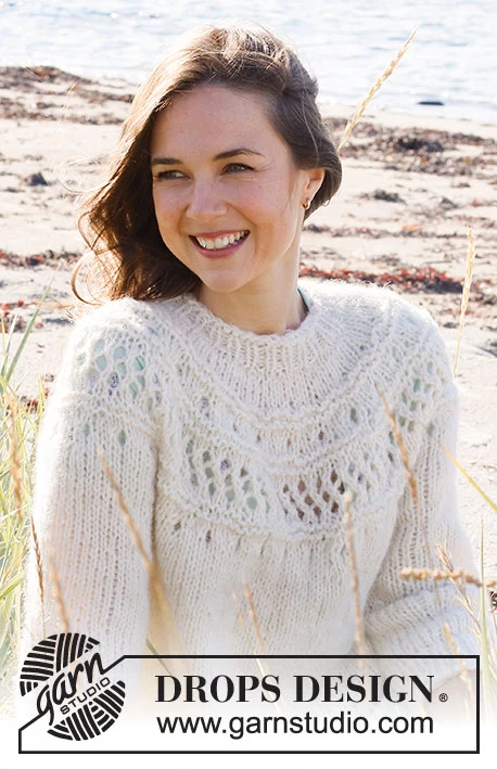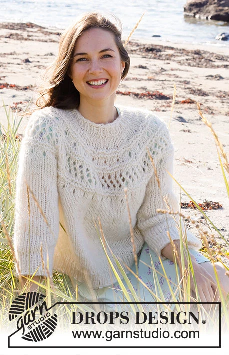 Strikket bluse i 1 tråd DROPS Air. Arbejdet strikkes ovenfra og ned med rundt bærestykke, hulmønster, retstrik og ¾ lange ærmer. Størrelse S - XXXL.