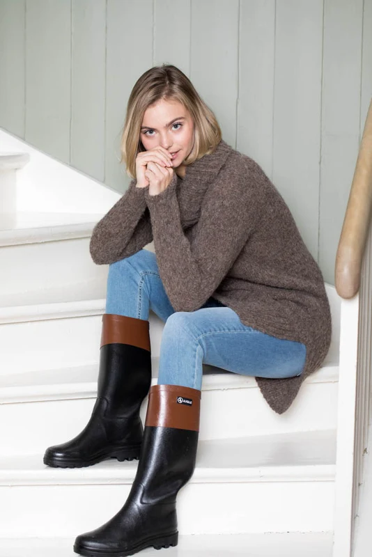 Lang bluse med rullekrave og slids strikket i Du Store Alpakka Faerytale. Str. XXS-XXXL.