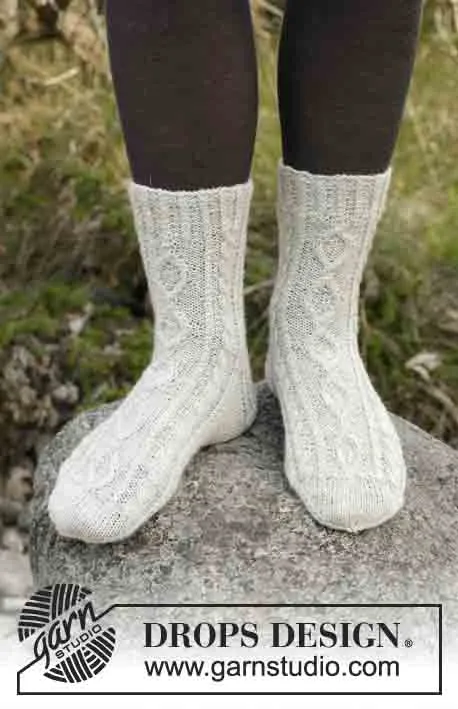 Strikkede sokker med snoninger. Størrelse 35 - 43. Arbejdet er strikket i DROPS Fabel.