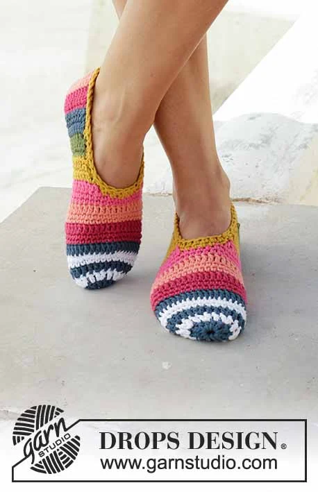 Hæklede tøfler med striber. Størrelse 35-43. Arbejdet er hæklet i DROPS Paris.