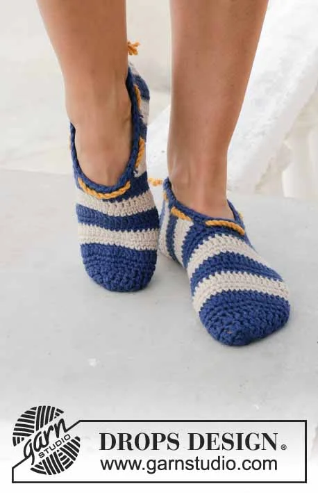 Hæklede tøfler med striber. Størrelse 35-43. Arbejdet er hæklet i DROPS Paris.