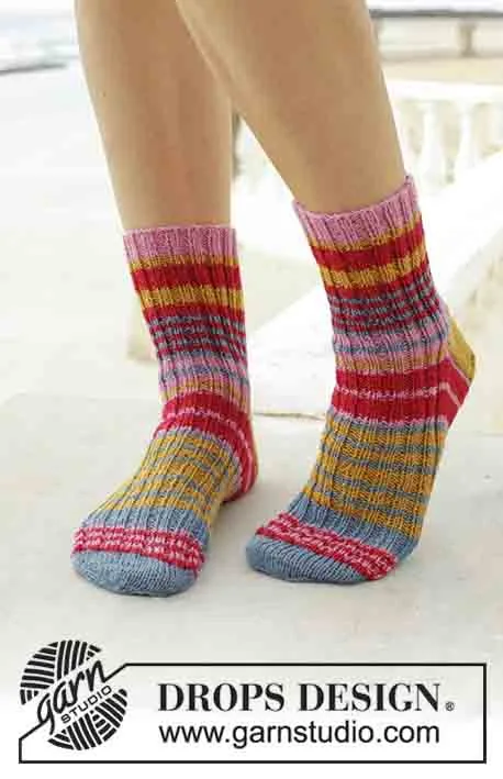 Strikkede sokker med rib og striber. Størrelse 35-43. Arbejdet er strikket i DROPS Fabel.