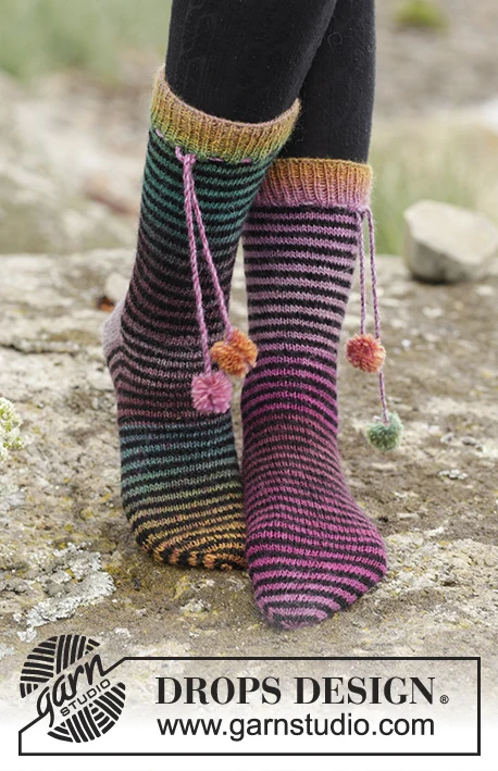 Strikkede DROPS sokker i ”DROPS Delight” og ”DROPS Fabel” med striber. Str 35 - 43.