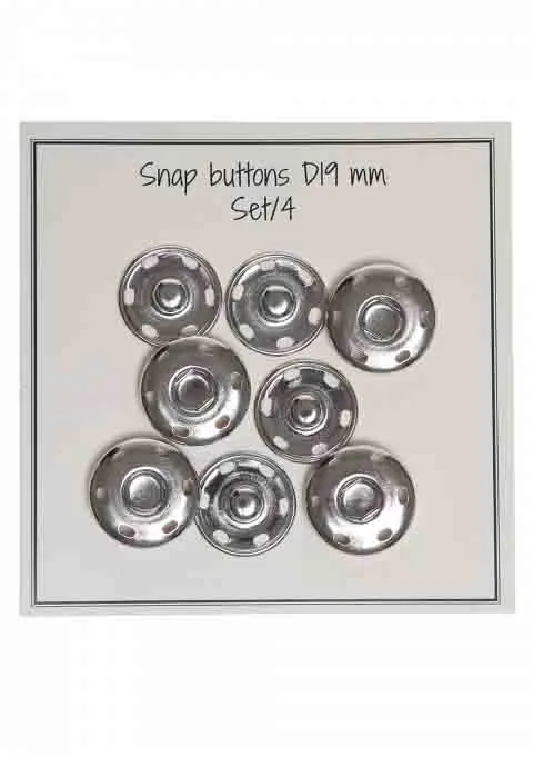 4 stk. trykknapper som er nemme at sy fast på tasker, punge og lignende. Knapperne har en diameter op 19 mm og fås i tre forskellige farver.